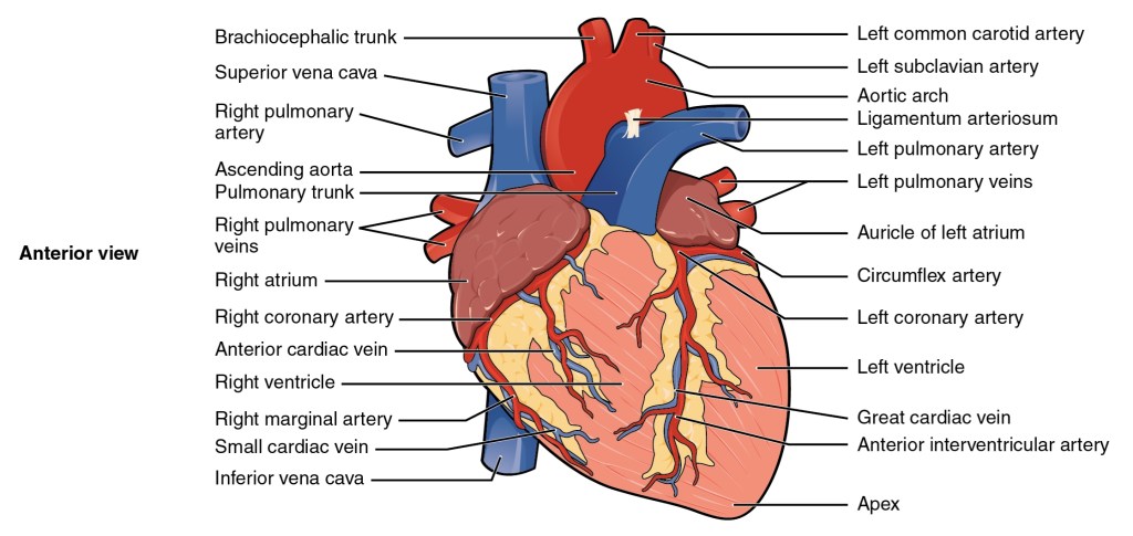 - Aorta: The aorta is the largest artery. It starts from the left side of the heart and carries oxygen-rich blood to the entire body. We can see its beginning parts (ascending aorta, arch, start of descending aorta) at the heart’s base. The heart’s own fuel lines, the coronary arteries, branch off from the very start of the aorta.