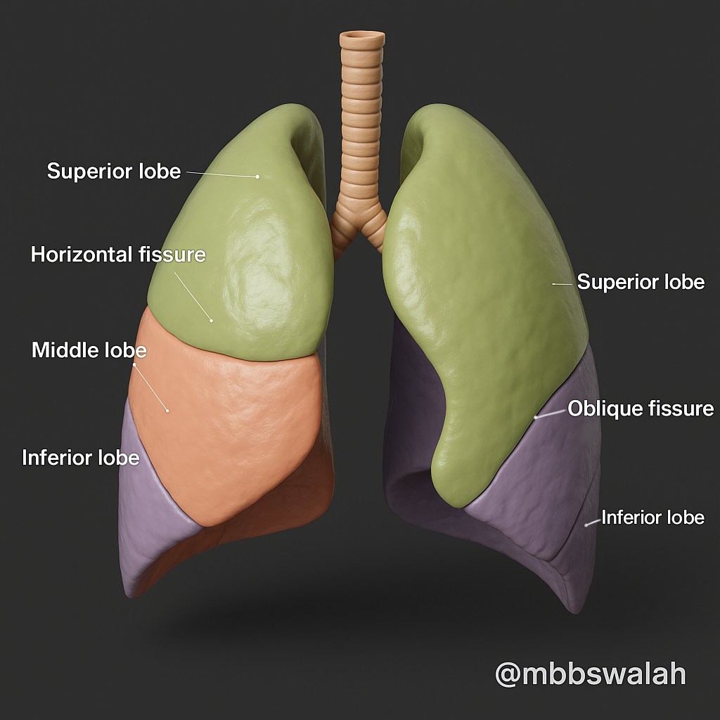 – The right lung has three lobes (upper, middle, lower) divided by horizontal and oblique fissures.